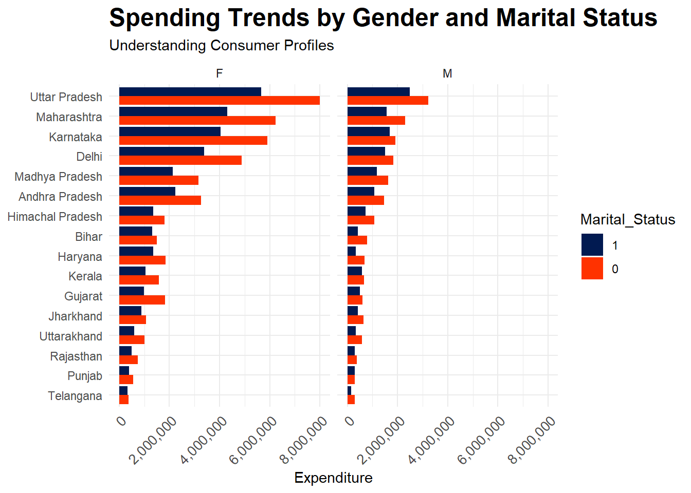 - How does marital status influence spending patterns across different states and genders?
